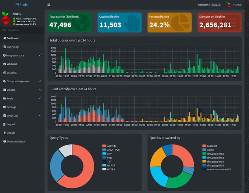 The Pi-hole® is a DNS sinkhole that protects your devices from unwanted content, without installing any client-side software.